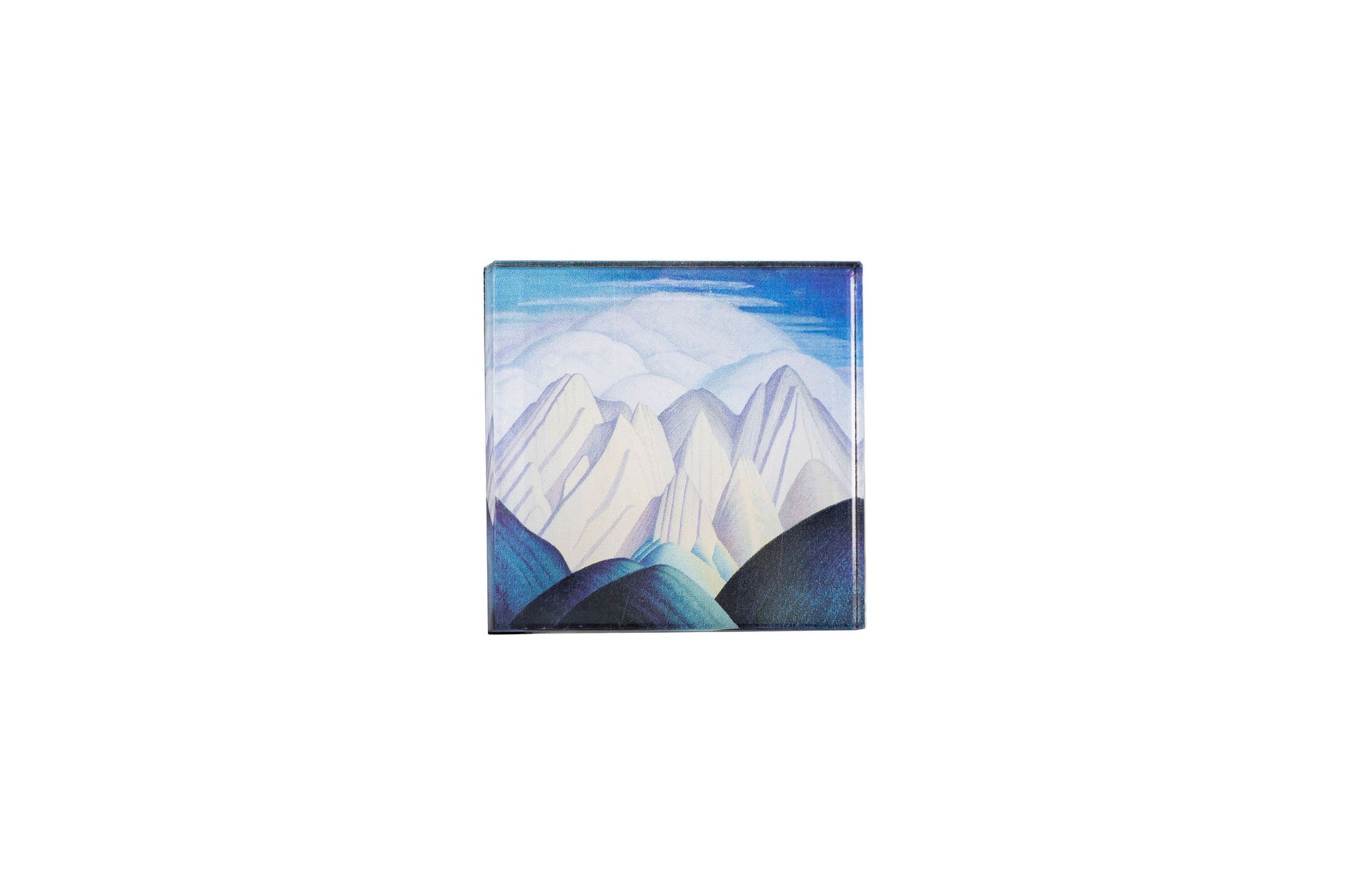 This collectible magnet commemorates the Views from the Blue House exhibition at Remai Modern. It showcases Lawren S. Harris's "Untitled (Mountains near Jasper)" artwork, expertly reproduced in a compact 5 x 5cm (2"x2") format, perfect for displaying on any magnetic surface.