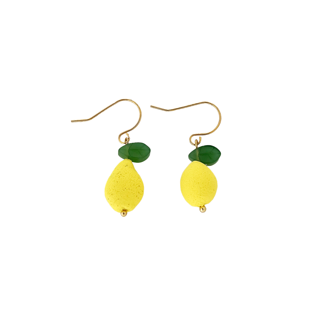 3D lemon earrings in polymer clay come with a beautiful glass leaf bead, and hypoallergenic stainless steel hooks. Due to the nature of the materials, the earrings are super lightweight . Size: Earrings: 1.75 in.