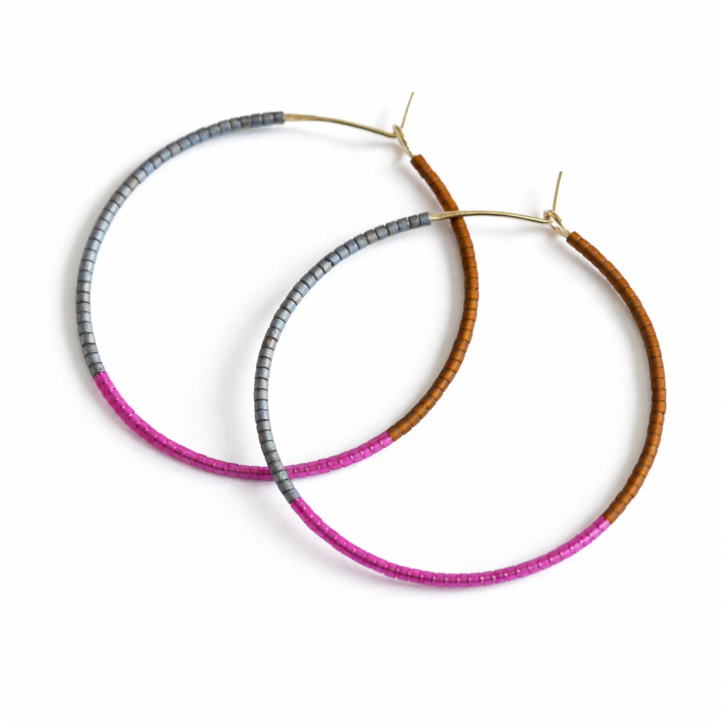 Gold hoop earrings are an essential accessory to have at hand. These feel light as a feather, and look super delicate, effortlessly complimenting our daily looks. Gold & Glass are all it takes for a small earring with a touch of colour! 1.75" gold hoops, lightweight and perfect for everyday wear.Colours: gun metal, deep magenta, and dark cherry brown. Materials used: Japanese glass beads, and hand forged 14 KT gold filled hoops for sensitive ears.