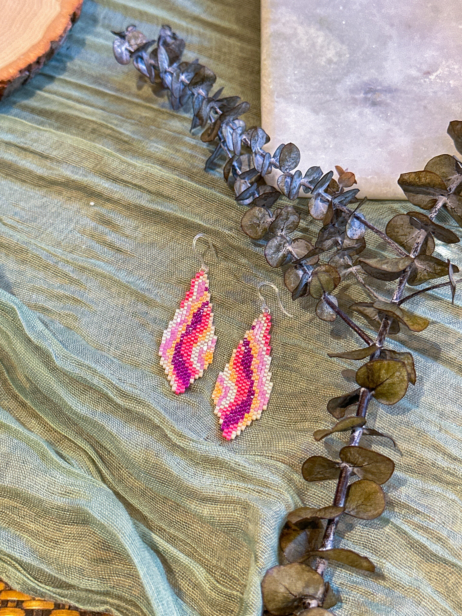 Crafted by designer Parker Bourque, The Flowered Raven. Beaded aurora inspired earrings. Hypoallergenic resin/plastic and sterling silver findings.hypoallergenic plastic posts and felt backing. Comfortable and stylish, these earrings are perfect for those with sensitive ears. Make a statement with these unique and eye-catching accessories.