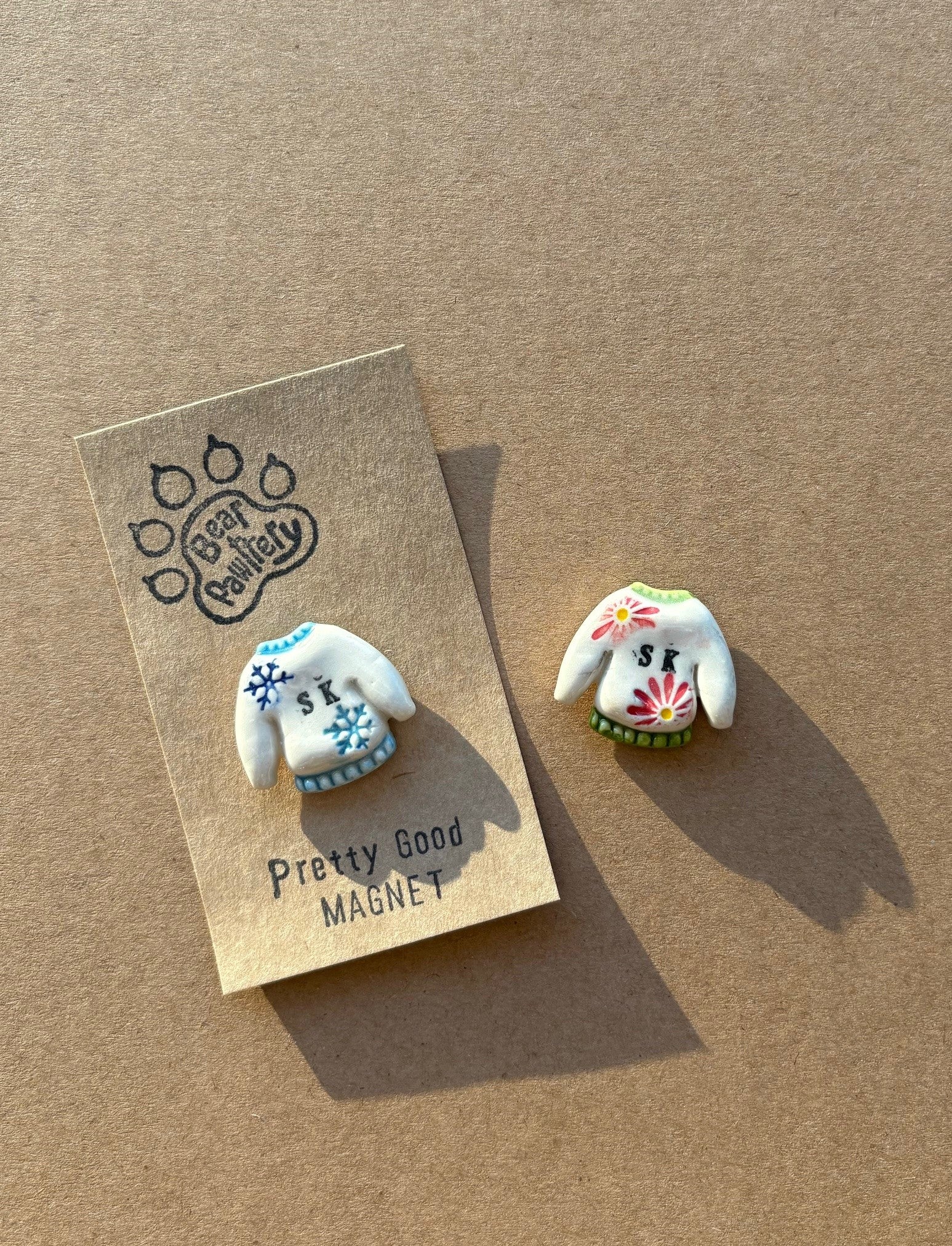 Adorable Ceramic Sweater ornaments. Adorned with a stamped SK and various handpainted sweater patterns. Sold Each.