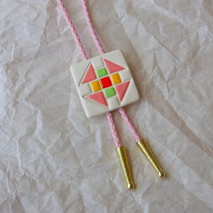 This handmade and hand-painted ceramic bolo tie is made with a vegan leather cord and gold-plated bolo ends. Quilt square measures just under 1.5" across. Bolo measures 31" in total length.