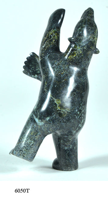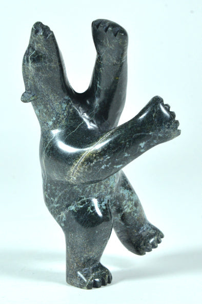 Stone carving titled "Dancing Polar Bear created by Matiusie Kinwatsiaq. Dimensions are approximately 6 inches by 3 inches.