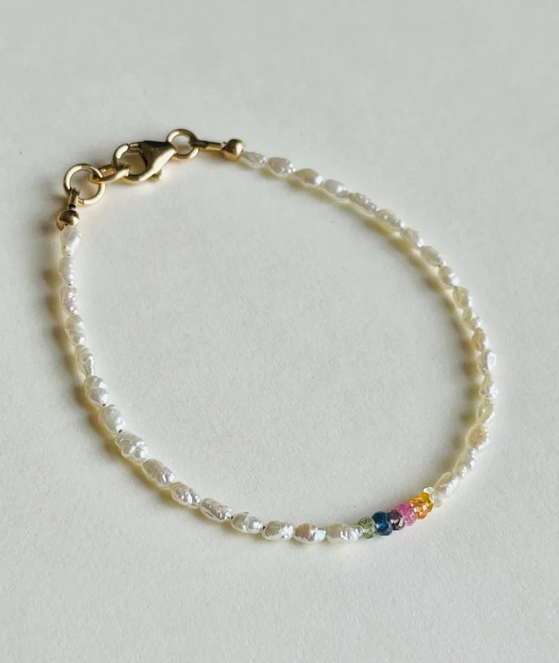 Part of Dore by Lisa Adele's holiday collection Luminaria, this baroque fresh water pearl bracelet features high quality delicate rainbow sapphires. Italian made 18k gold vermeil findings.