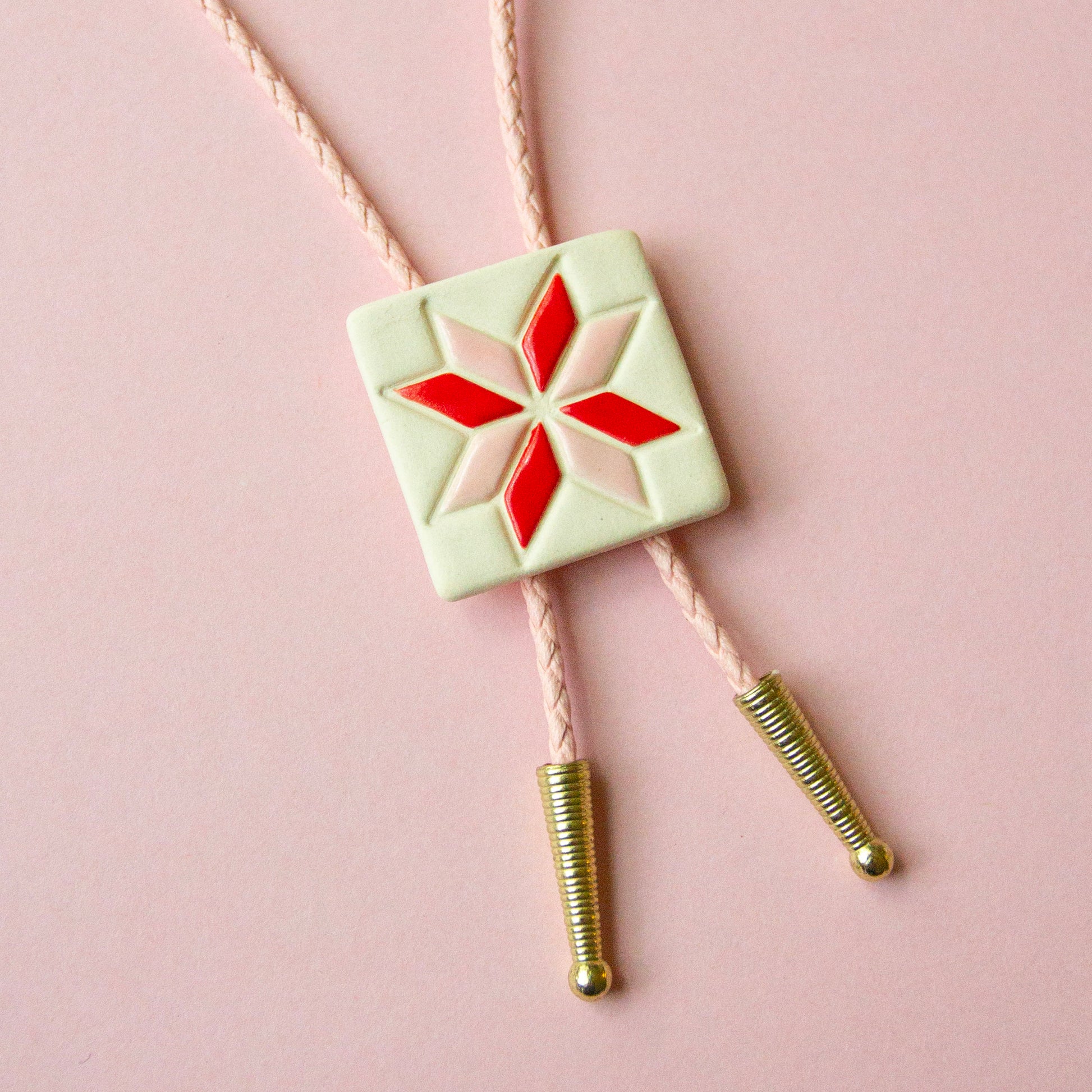 This handmade and hand-painted ceramic bolo tie is made with a vegan leather cord and gold-plated bolo ends. Quilt square measures just under 1.5" across. Bolo measures 31" in total length.