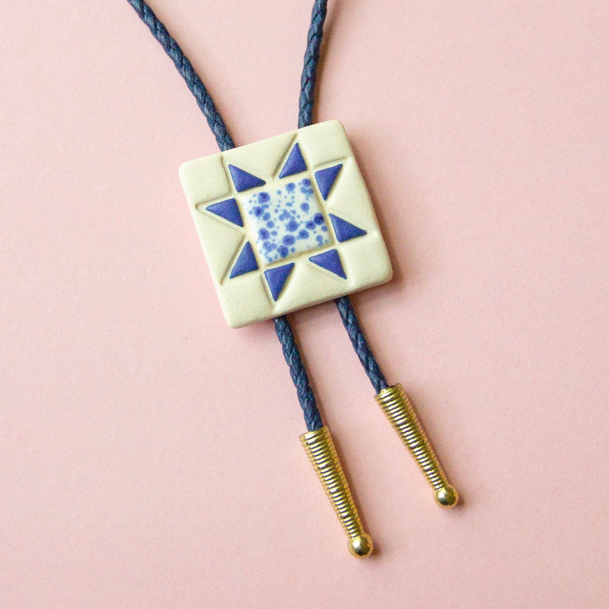 This handmade and hand-painted ceramic bolo tie is made with a vegan leather cord and gold-plated bolo ends. Quilt square measures just under 1.5" across. Bolo measures 31" in total length.
