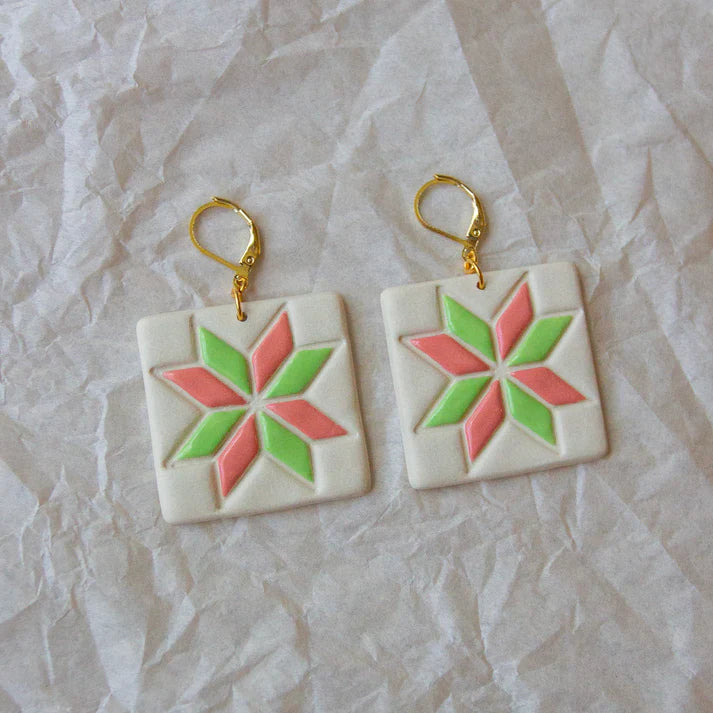 These handmade and hand-painted ceramic earrings represent the artists love of quilting. They measure just Just over 2” long. With gold-plated stainless steel clasps that are lead, cadmium, and nickel-free.