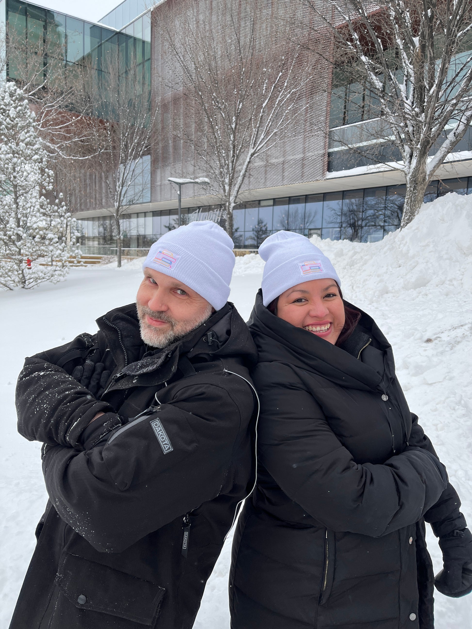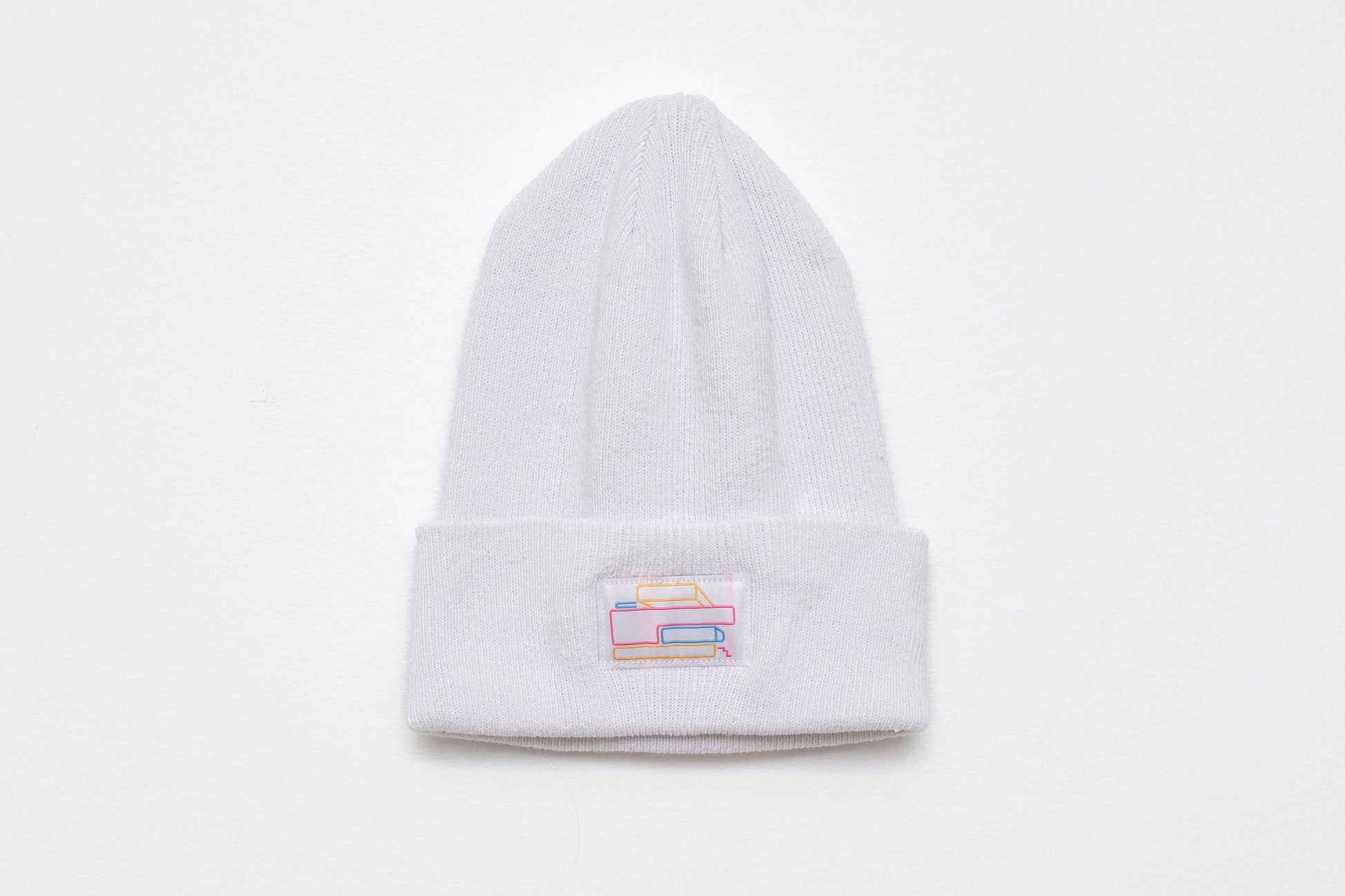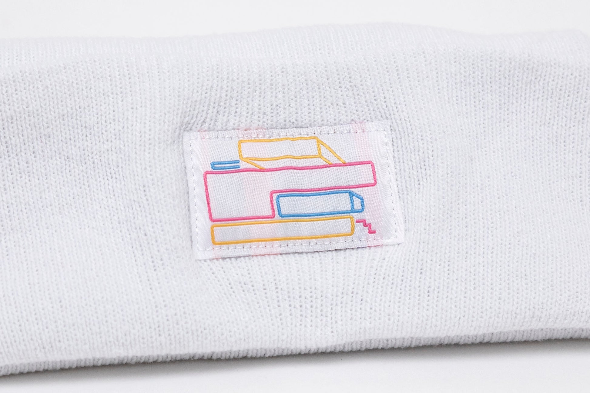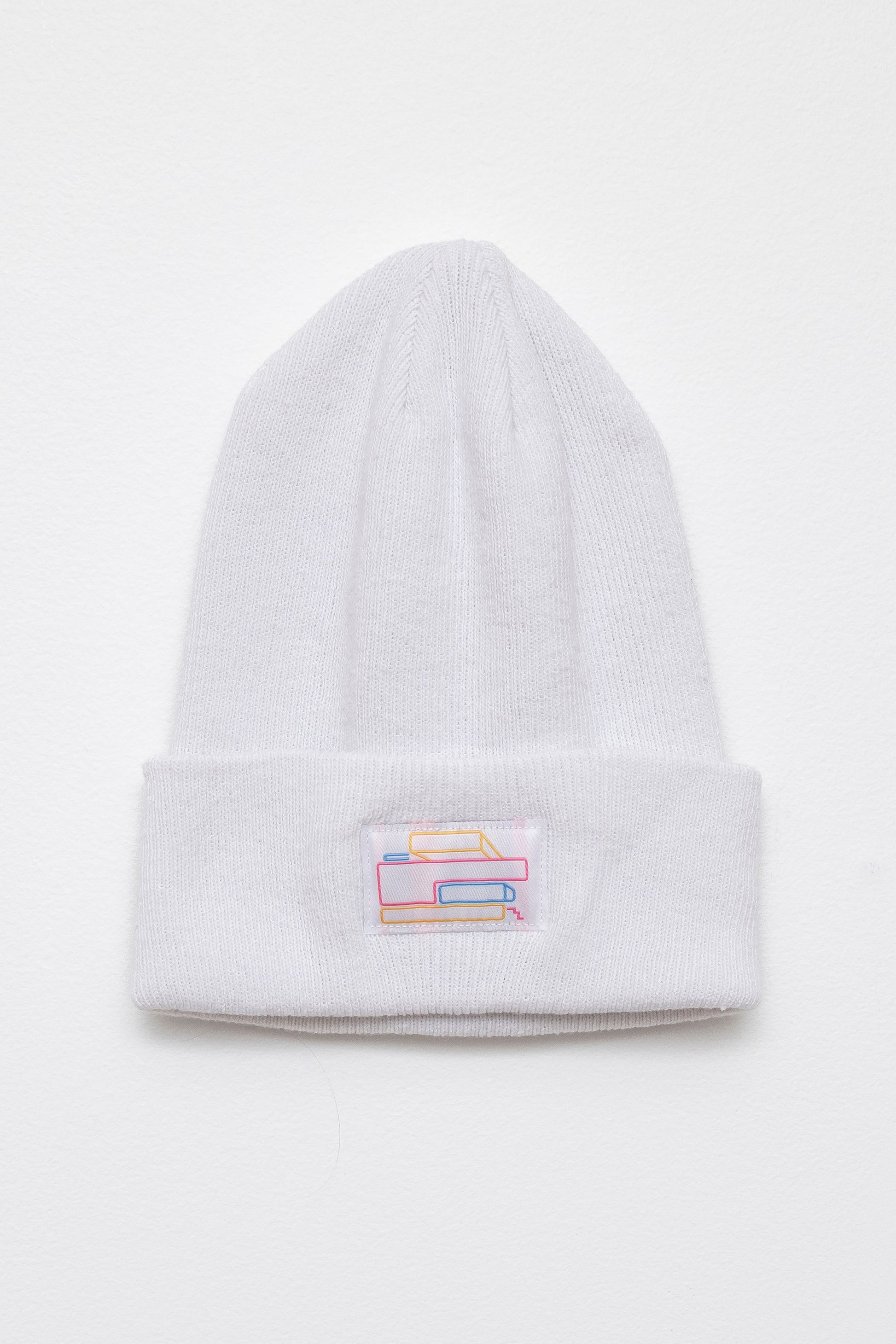 Stay warm with sustainable style this winter with our new and exclusive Pae White Inspired design Recycled Cotton Toque made in Canada. The woven label is decorated locally in Saskatoon and features an outline of Remai Modern in Blue, Pink, and yellow.