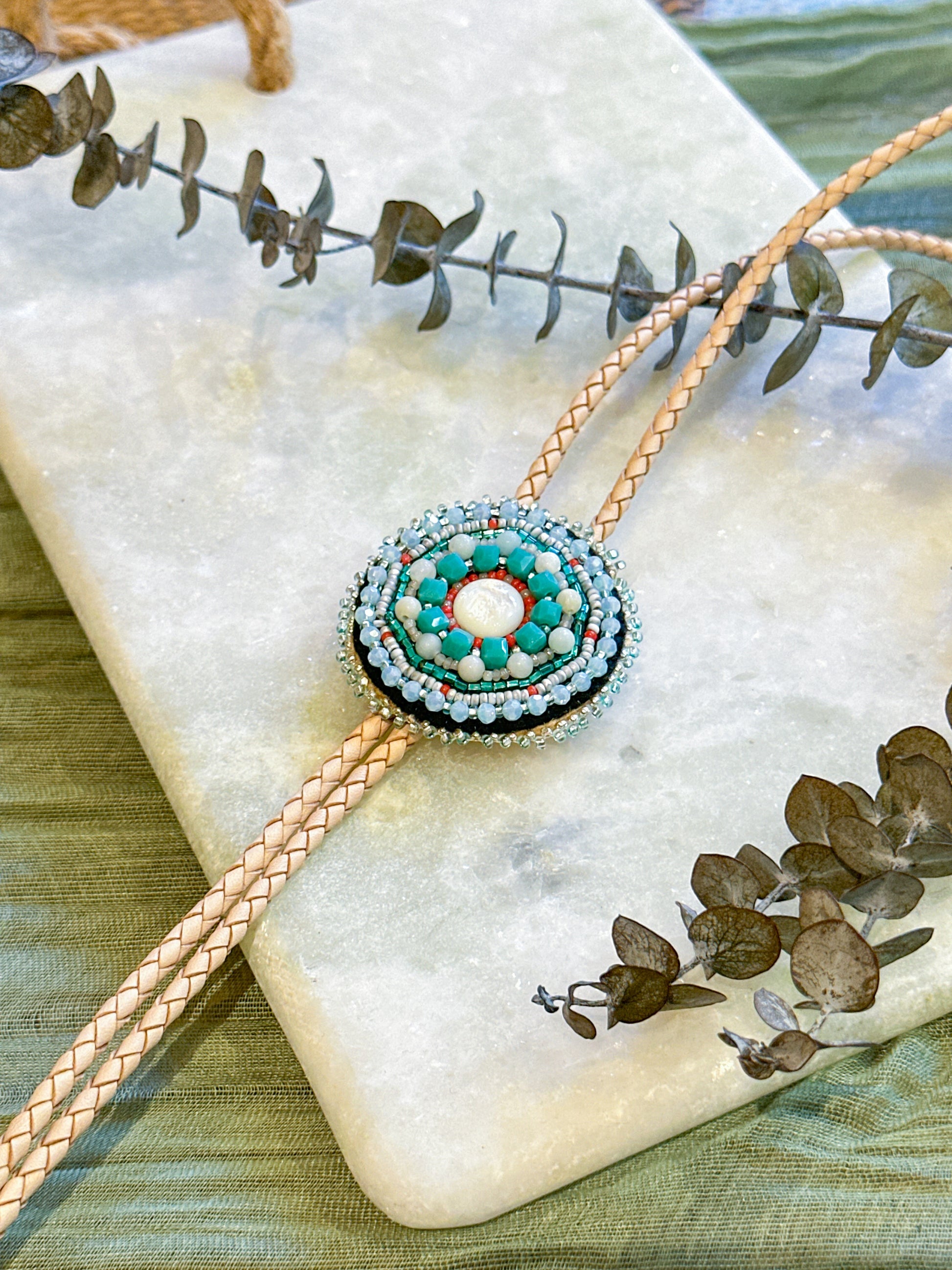 Crafted by designer Parker Bourque, The Flowered Raven. Salmon Bolo. Mother-of-pearl cabochon, sterling silver plated beads, Home-tanned Moosehide.