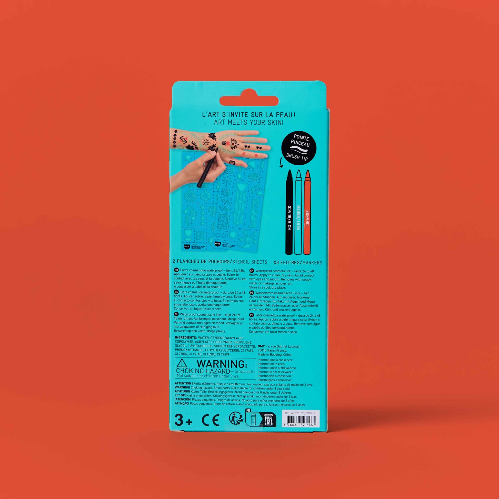 Ink Markers and stencils Tattoos kit Express your creativity with these markers (black, green and red) specially designed for the skin. Their ink dries quickly and lasts up to 2 days without smudging. The brush tip lets you draw fine or thick lines, fill in areas, or add precise details. The kit includes 25 stencils to guide or inspire your creations. Perfect for creating unique temporary tattoos, whether freehand or using the stencils. 💧 Easily removes with soapy water or a bit of makeup remover.