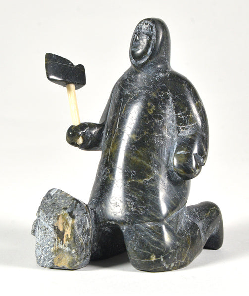 Stone carving titled "Carver" created by artist Pitseolak Quimirpik. Dimensions are approximately 4 inches by 3 inches.