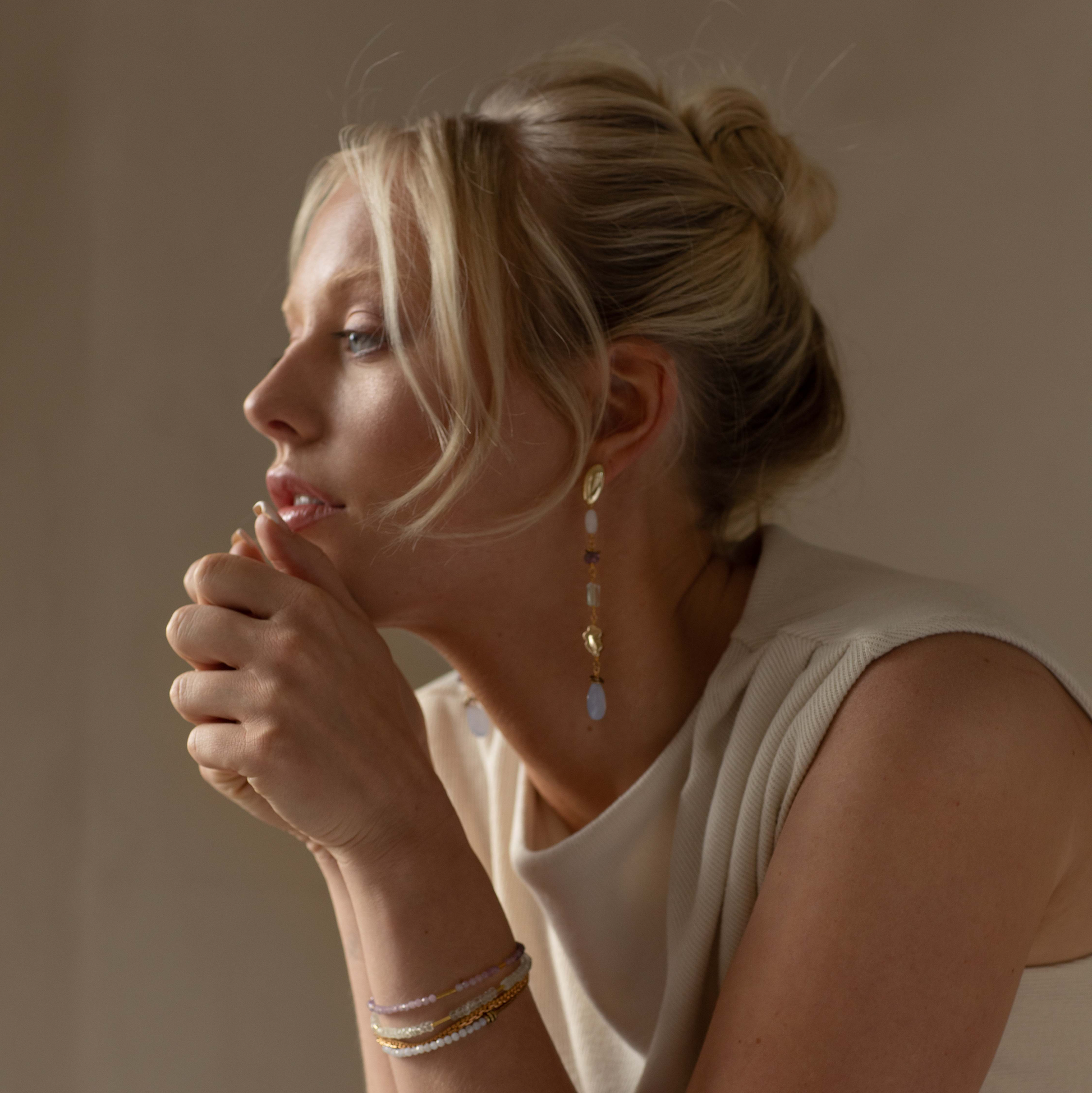 These statement earrings feature a long, glamorous design accented by a gold cloud motif and hand-cut gemstones in dreamy colors. Choose between Green Amethyst, Blue Lace Agate or Lepidolite to add a little bit of drama to your look.