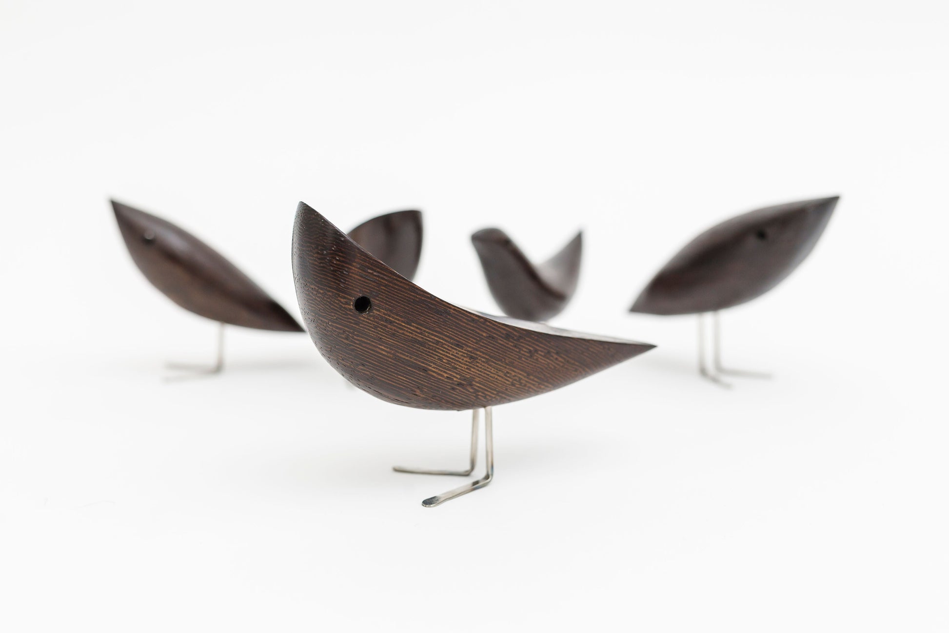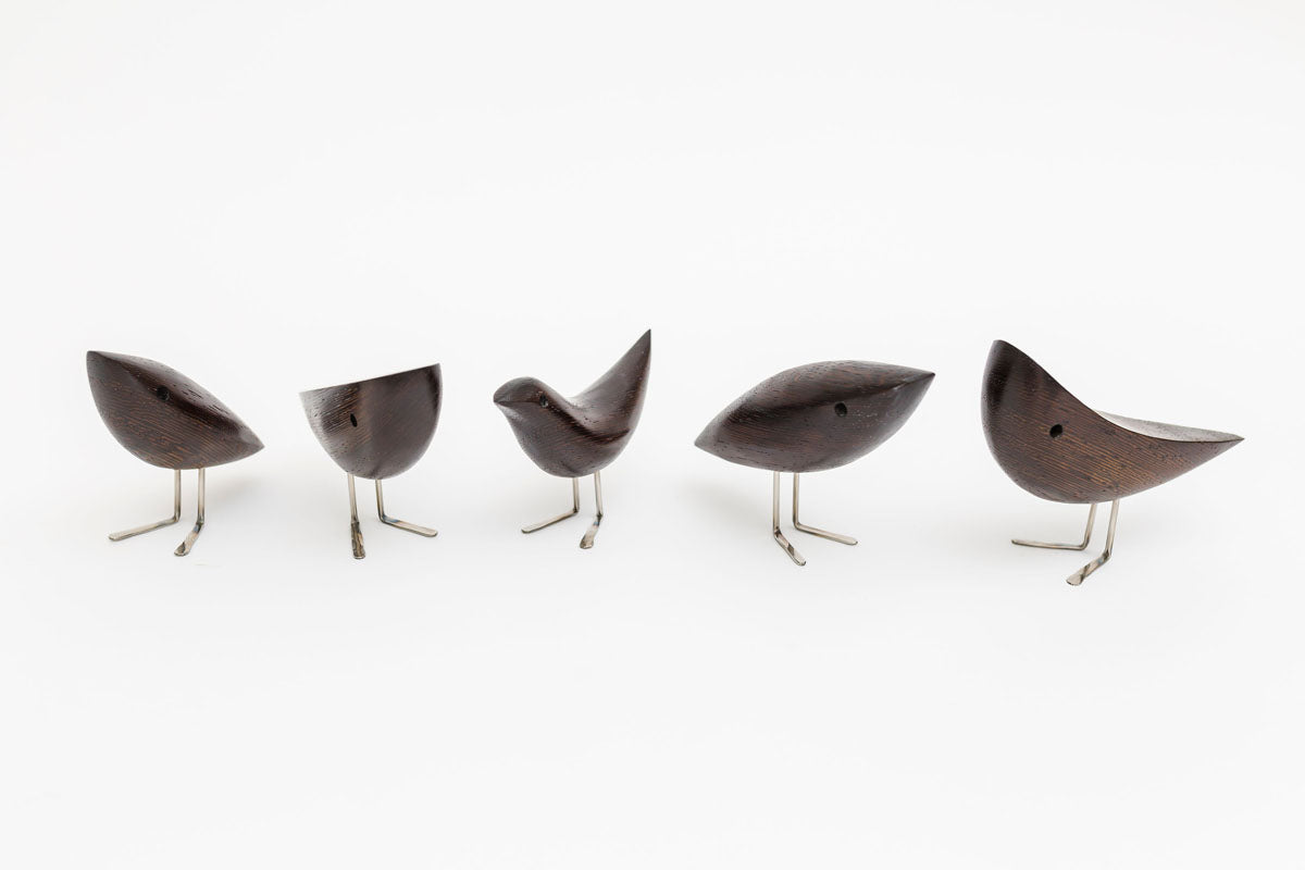 Saskatoon Artist Daryl Richardson designed and handcrafted this delightful set of 5 modern wood birds. Constructed of wenge wood and metal this set can be displayed in an endless variety of ways. Each bird measures approximately: Flatback 13x9x3, Small round 11x8x3cm, round curve back 12x9x3, and round large 14x10x4cm.