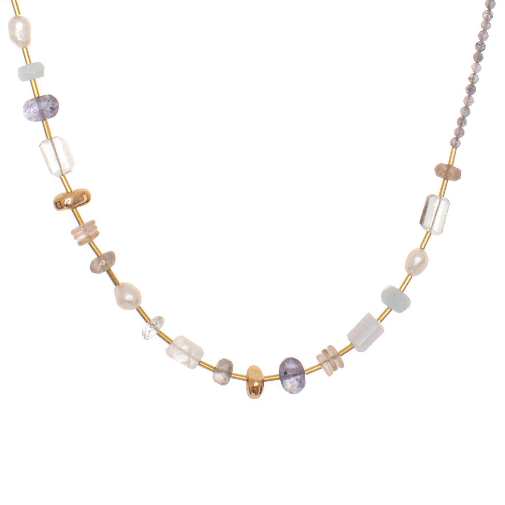 The Delta Necklace provides so much texture and interest with its unique asymmetrical combination of hand-cut gemstones, pearls and reclaimed brass beads. Moonstone, Aquamarine, Green Amethyst, Labradorite, Iolite and Freshwater Pearl are spaced throughout the necklace with beaded sections of both Labradorite and Iolite at the back. Length: 16" with 3" extender chain Artisan-cut natural gemstones Freshwater Pearl Reclaimed brass 14K gold-plated brass Handmade in Vancouver, BC.