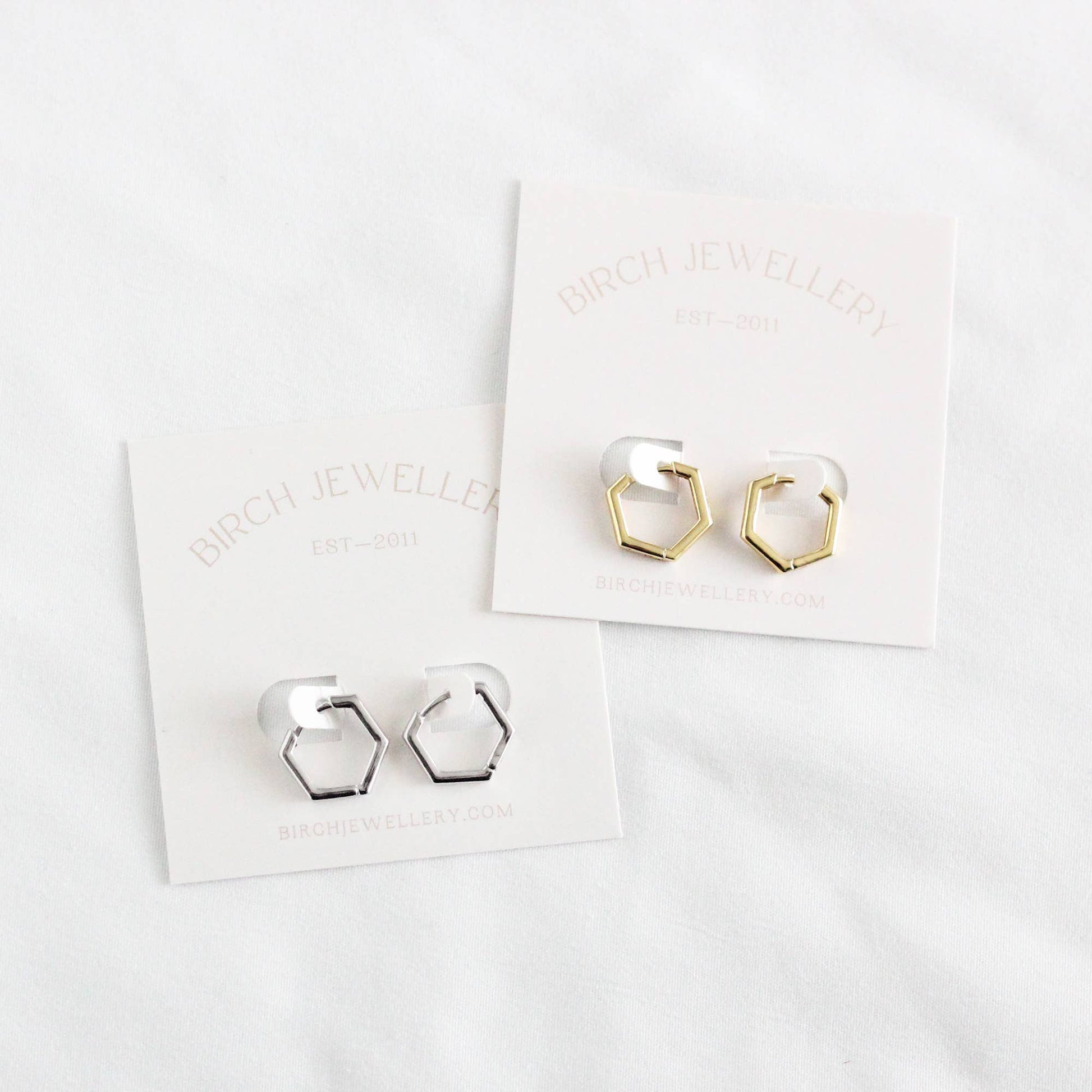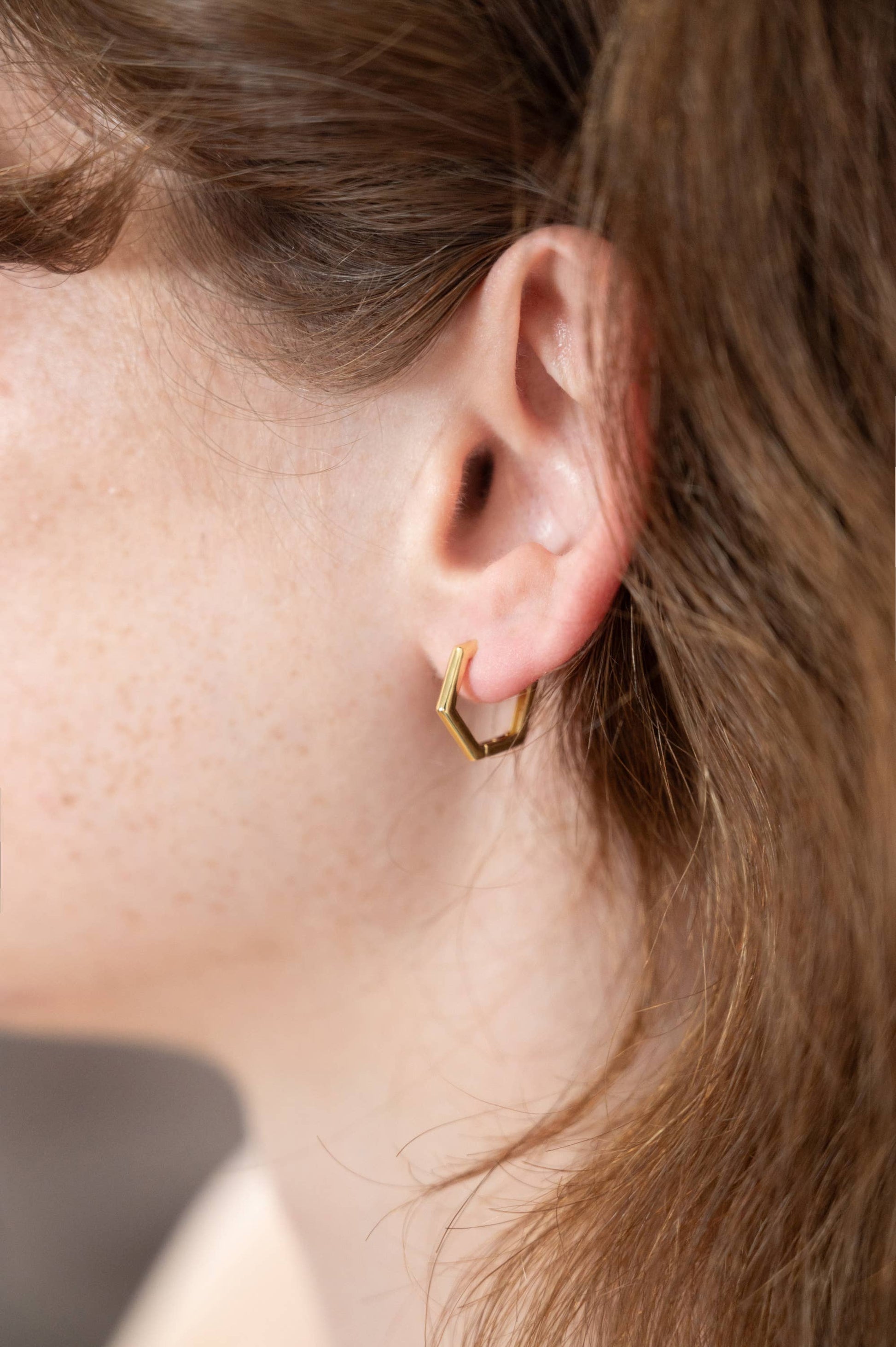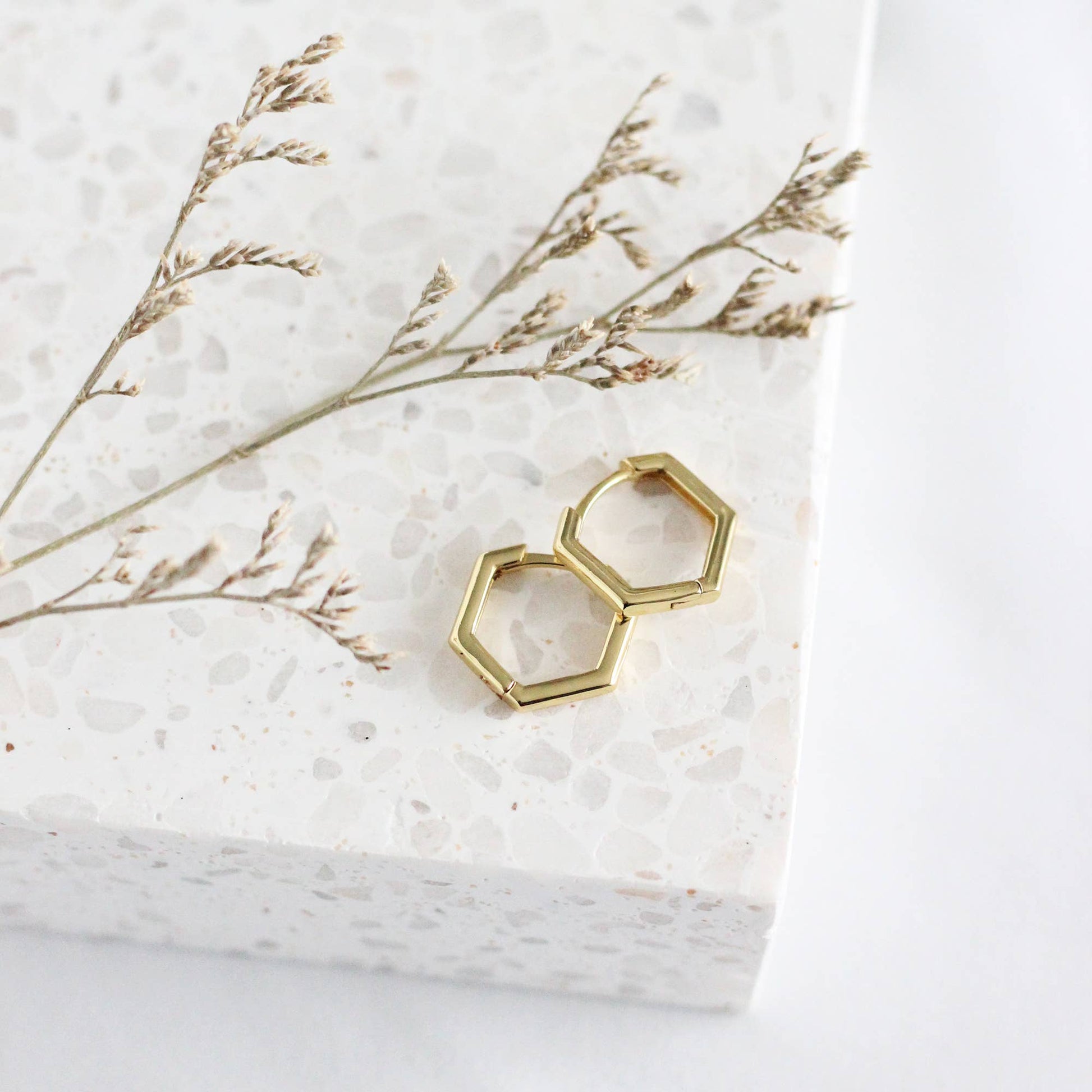 A geometric huggie hoop inspired by our the shape of a honeycomb. They are anything but average and will quickly become a favourite amongst your hive. Featuring a clicker hinge closure for comfort and security. ○ 14k gold-plated or silver stainless steel hoops; nickel-free. ○ Approximate hoop size: 14 mm.