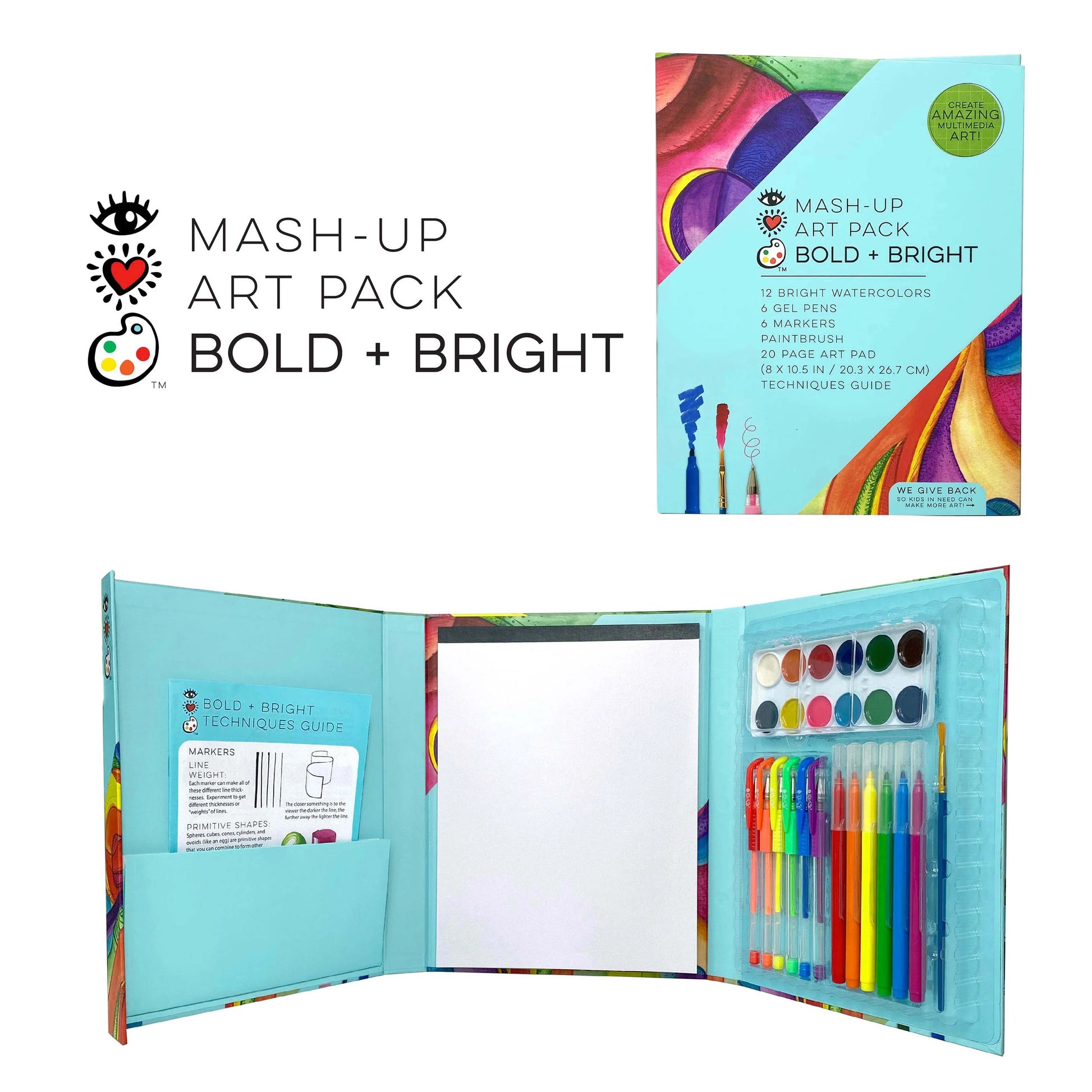 Create bold and bright works of art with this comprehensive set that includes tons of richly pigmented art supplies and a high-quality paper pad all in one fold-up art portfolio! Comes with 12 watercolors, 8 gel pens, 8 markers, 2 paint brushes, 25-page art pad and a Techniques Guide.  iHeartArt carries only top-quality supplies for artists 7 to adult.