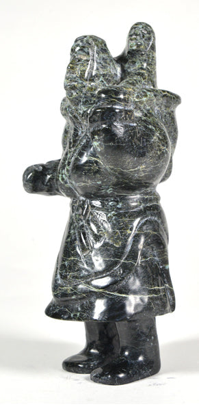 Stone carving titled "Mother and Child" created by artist Kellipalik Etidloie. Dimensions are approximately 8 inches by 3 inches.