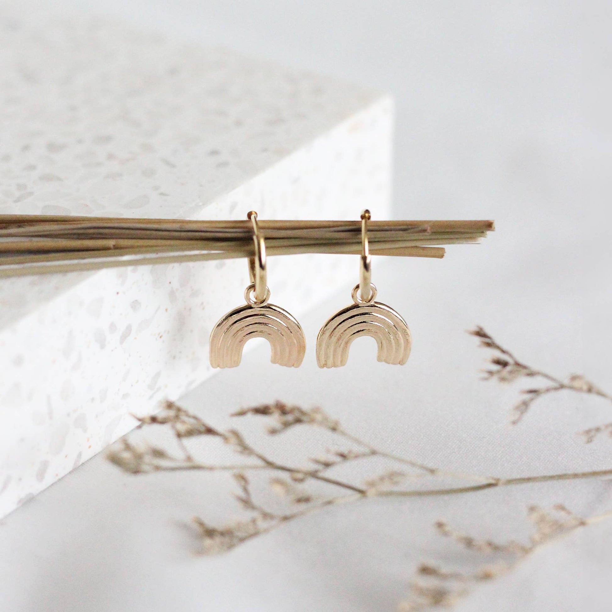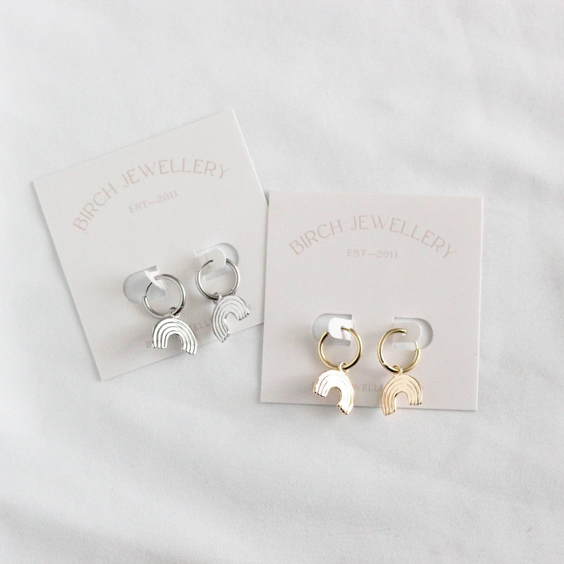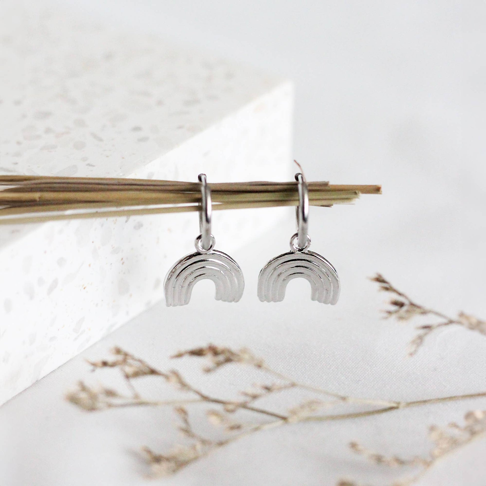These refined silver hoops showcase a delicate rainbow arch charm, merging natural elegance with imaginative design. The piece combines 18k silver-plated, nickel-free metal with hypoallergenic stainless steel hoops for superior comfort. The 15 mm charm creates a sophisticated yet whimsical aesthetic, perfect for elevating any ensemble with a touch of celestial inspiration.
