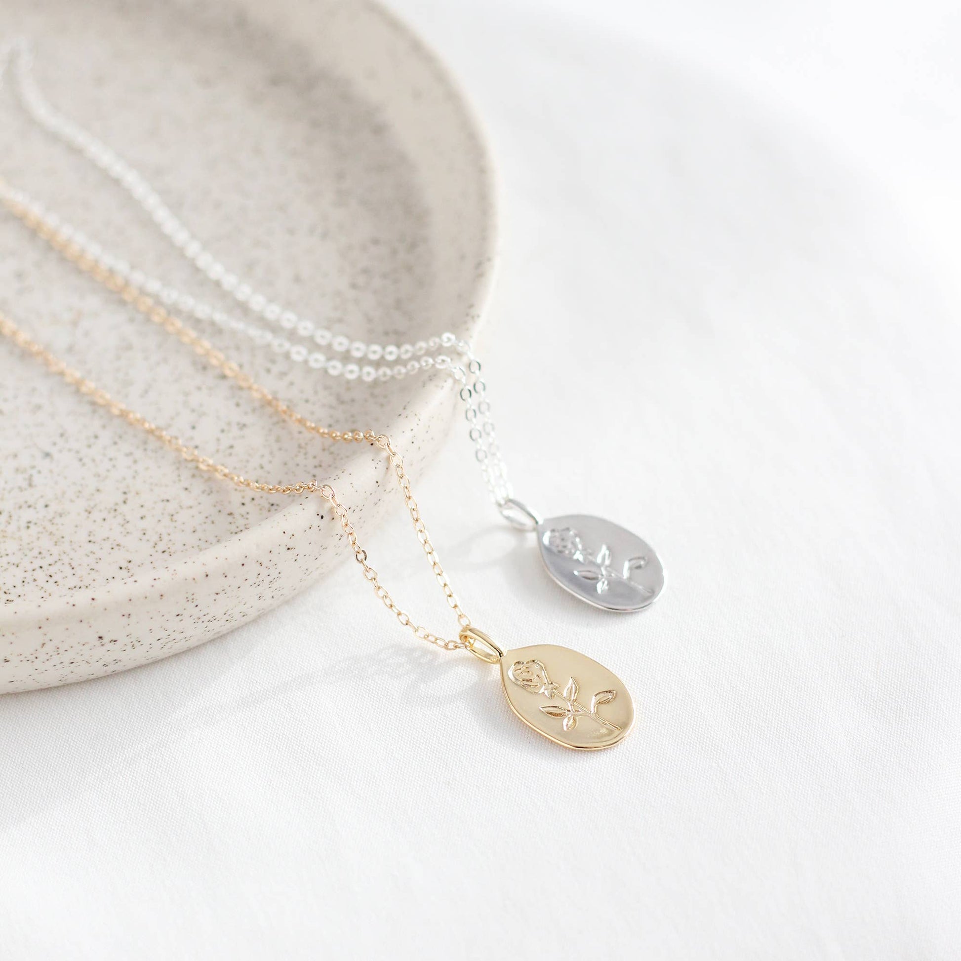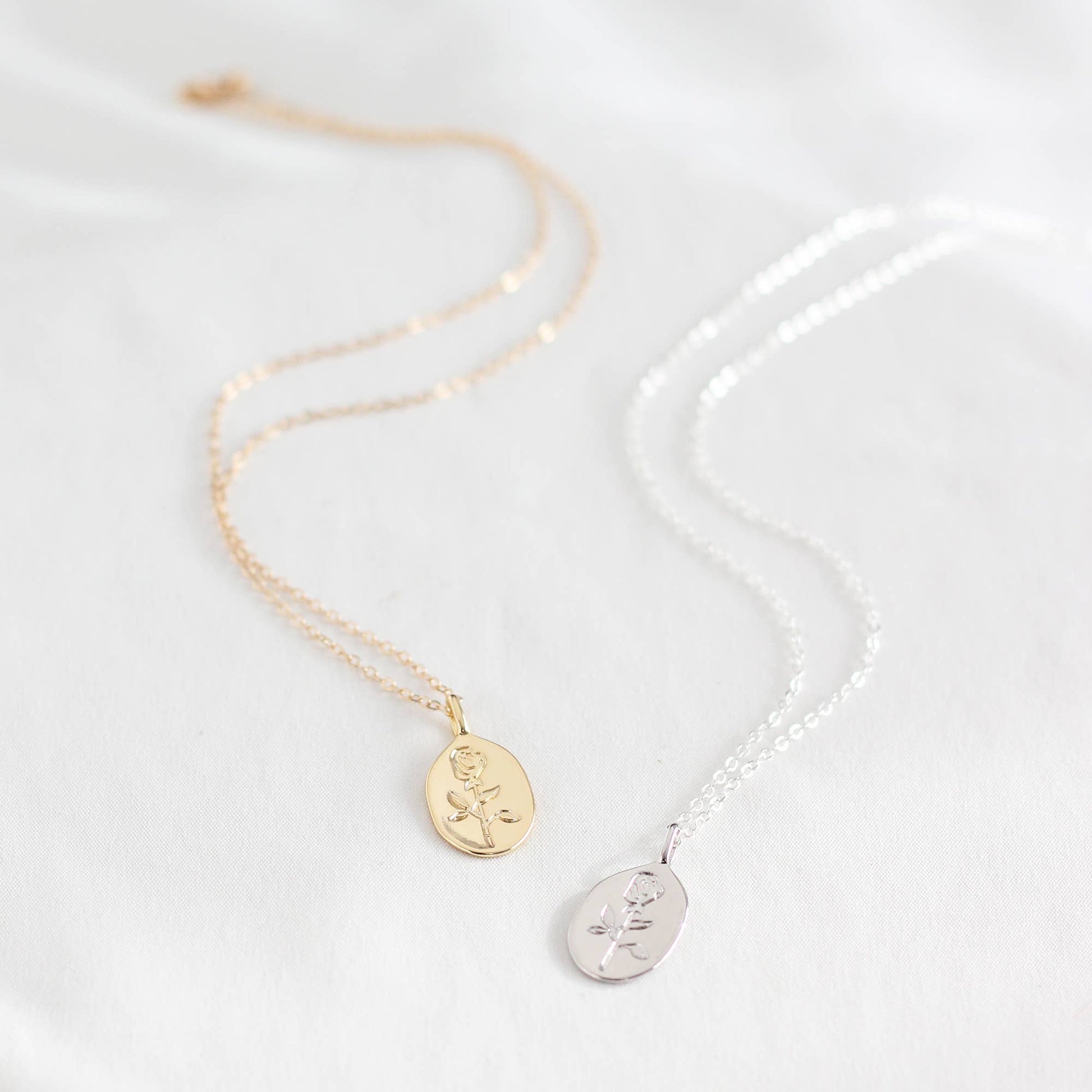 A timeless, vintage-inspired medallion necklace featuring a romantic rose design. Perfect to stack with your other favourites or to wear solo. Silver or 14k gold-plated metal; brass core chain; nickel-free. Chain length: 18 inches. Pendant size: 13 mm. Signature lobster clasp closure.