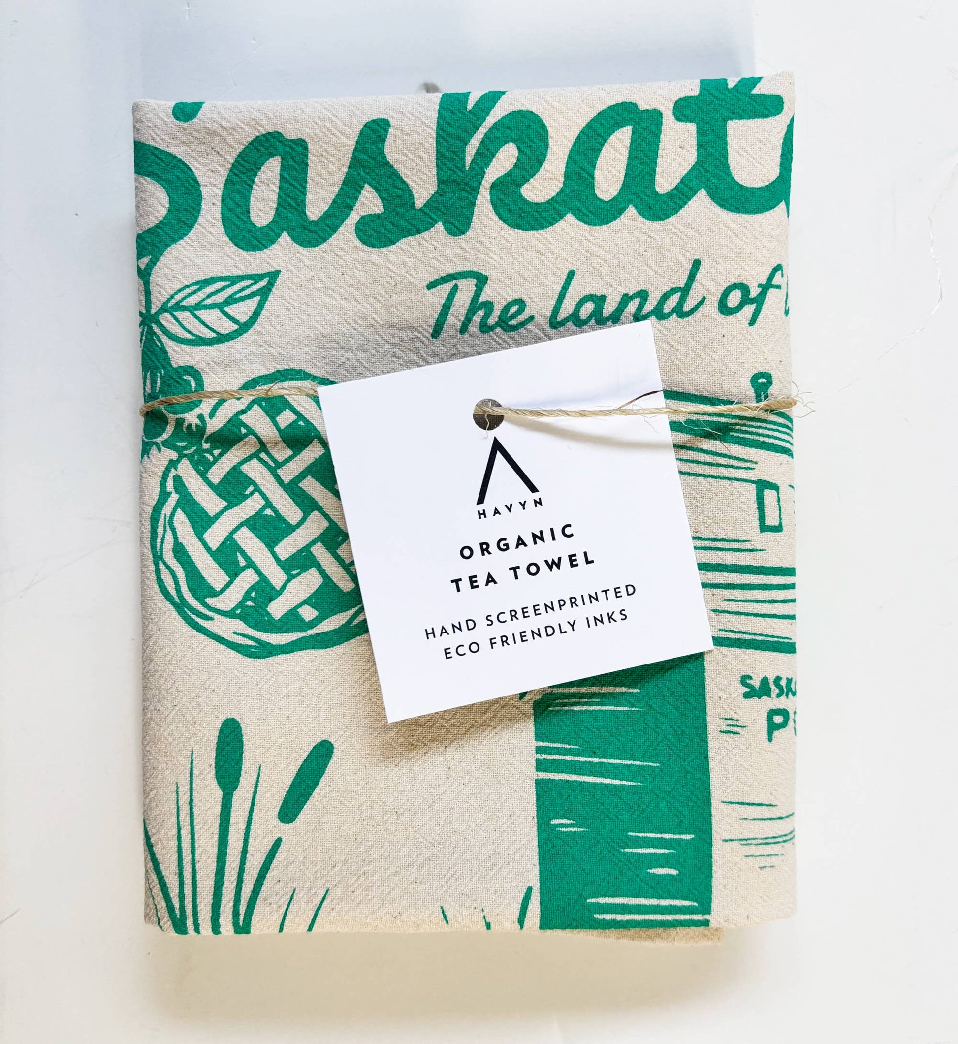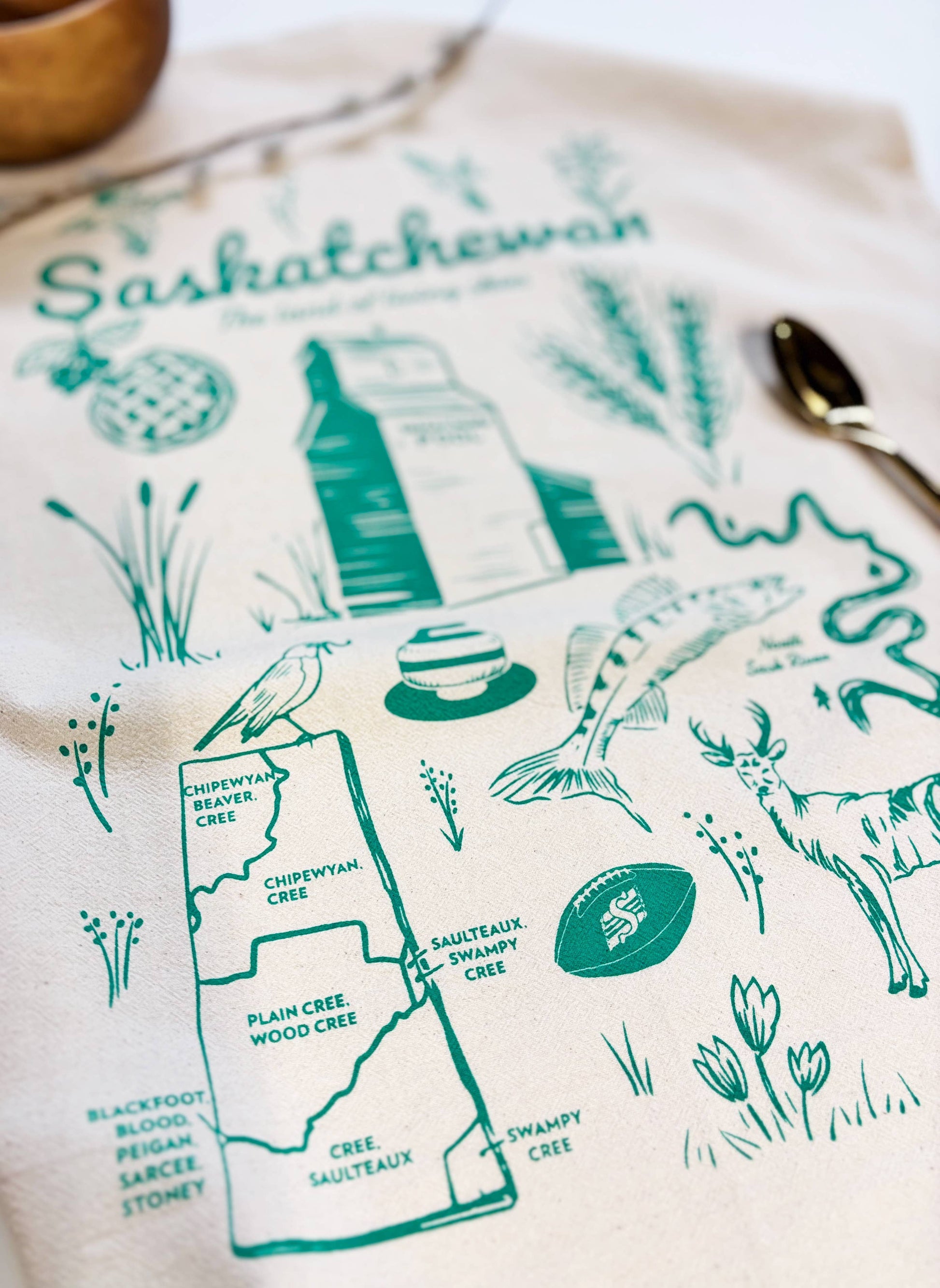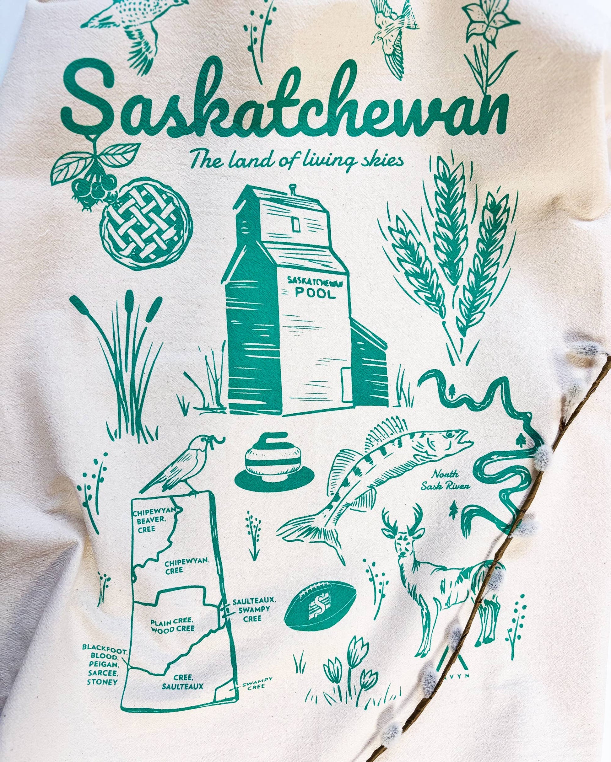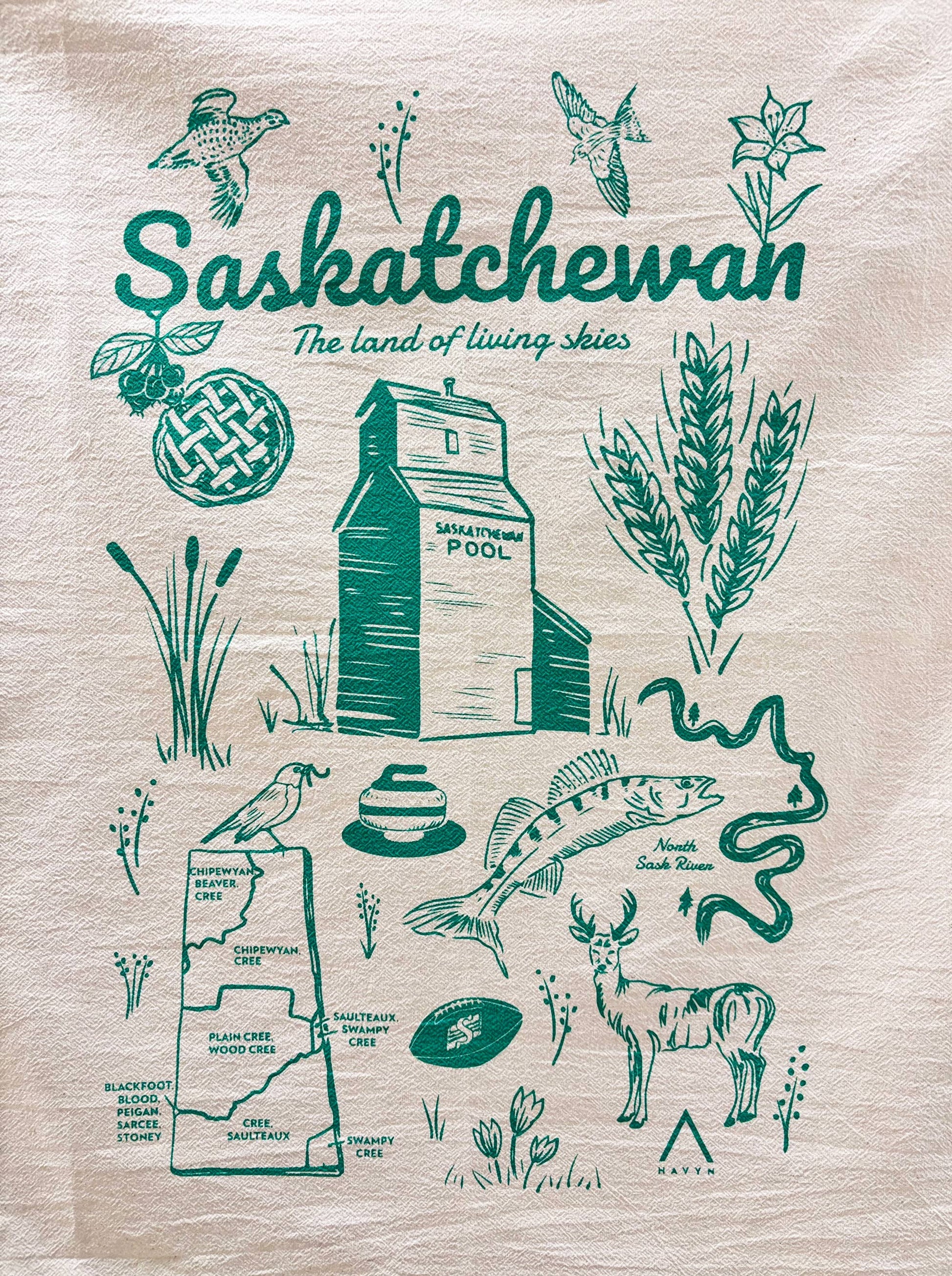 Hand Screen Printed in Emerald green eco ink. Various Symbols of Saskatchewan (clockwise from top left): Sharp-Tailed Grouse (Provincial Bird), Barn Swallow, Western Red Lily (Provincial Flower), Wheat, North Saskatchewan River and Walleye (Provincial Fish), White-Tailed Deer (Provincial Animal), Crocuses, Saskatchewan Roughrider Football (CFL), Indigenous Land Territory Map, Robin, Curling, Saskatchewan Grain Elevator, Cat Tails, Saskatoon Berries (Provincial Fruit) & Pie. Made of GOTS certified ORGANIC COTTON FLOURSACK. All towels are hand screen printed with eco-friendly inks using Paula's own original drawings on 20x24 inches, pre-washed Indian cotton floursack with a loop at the back for hanging. Art is centered and occupies roughly 12x15 inches of the tea towel. These are individually hand printed on textured organic towels so position and ink may vary on fabric surface.