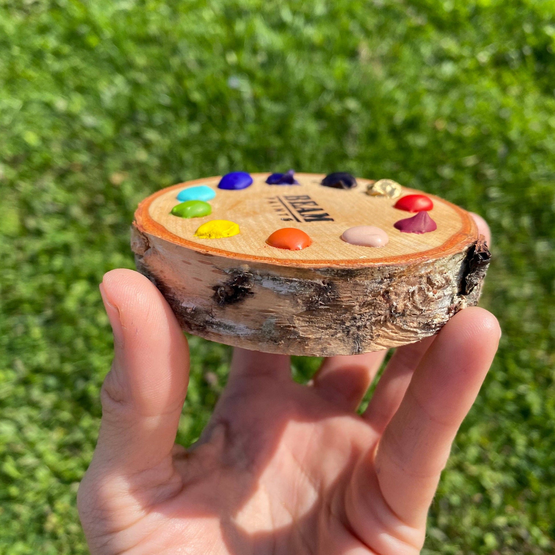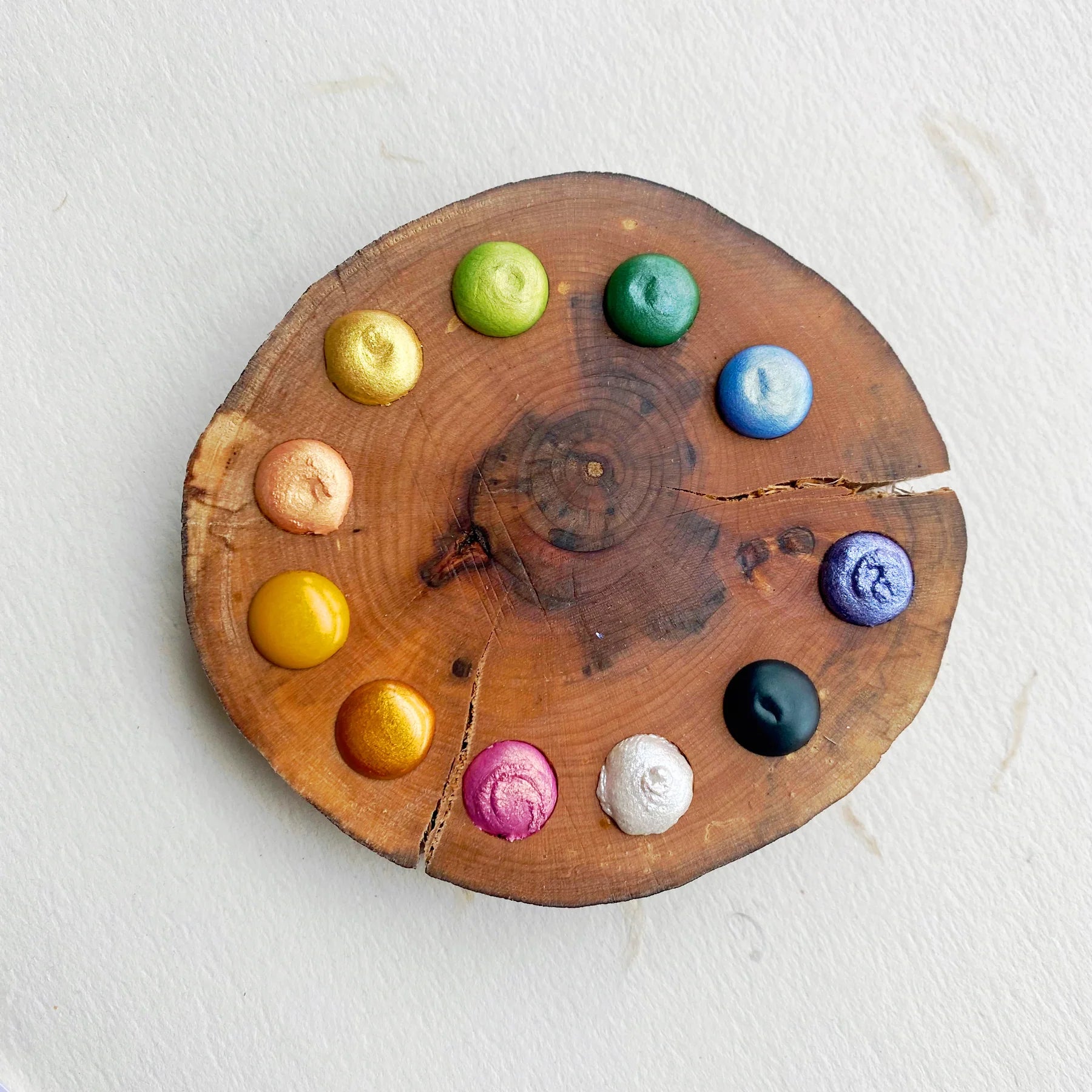 The sweetest travel palette of colours set in a reclaimed white birch block from Manitoulin Island and finished with warm beeswax. All paints are handmade in small batches with local Manitoulin honey, wildcrafted tree sap, hand gathered, washed and sifted Manitoulin stone and the finest lightfast pigments. Available in three sizes