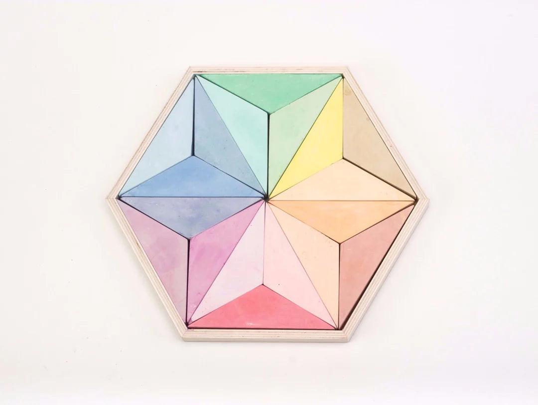 Full Spectrum Rainbow Chalk Set in a wooden box. The set contains 18 pieces of chalk in vivid colors that can be used to create chalk art on sidewalks and other surfaces. With its angled shape, this chalk is perfect for drawing fine lines or broad strokes. Comes in a decorative wooden chalk holder that can be used to display this colorful geometric chalk in a place of your choosing.