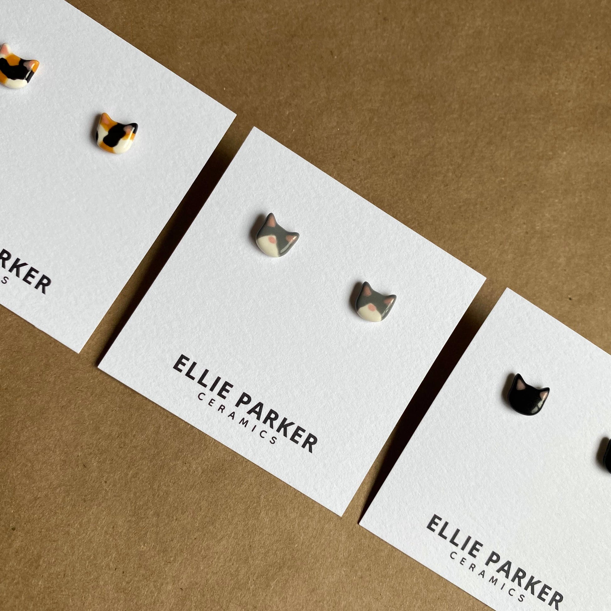These new cat studs are availble in three colour options: Grey & White Cat, Calico Cat, and Black Cat. Attached to stainless steel posts, these earrings are great for those with sensitive ears. Each individual stud measures approximately 0.28” x 0.31” .
