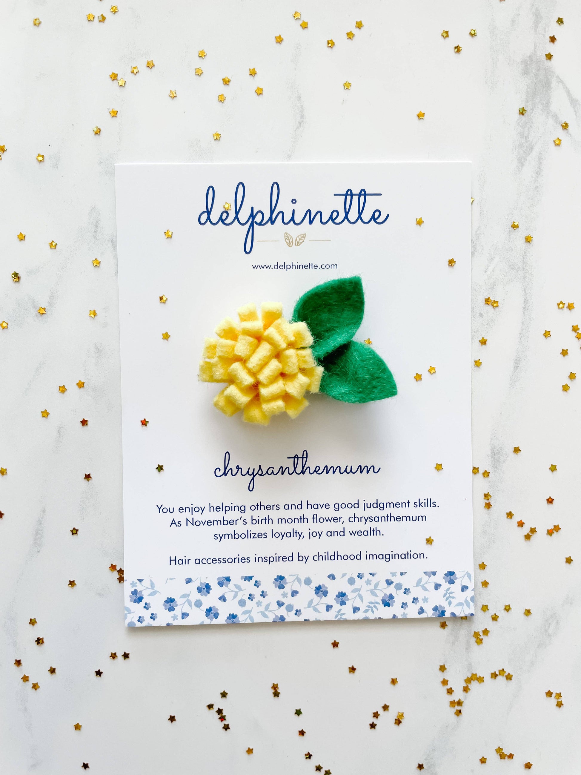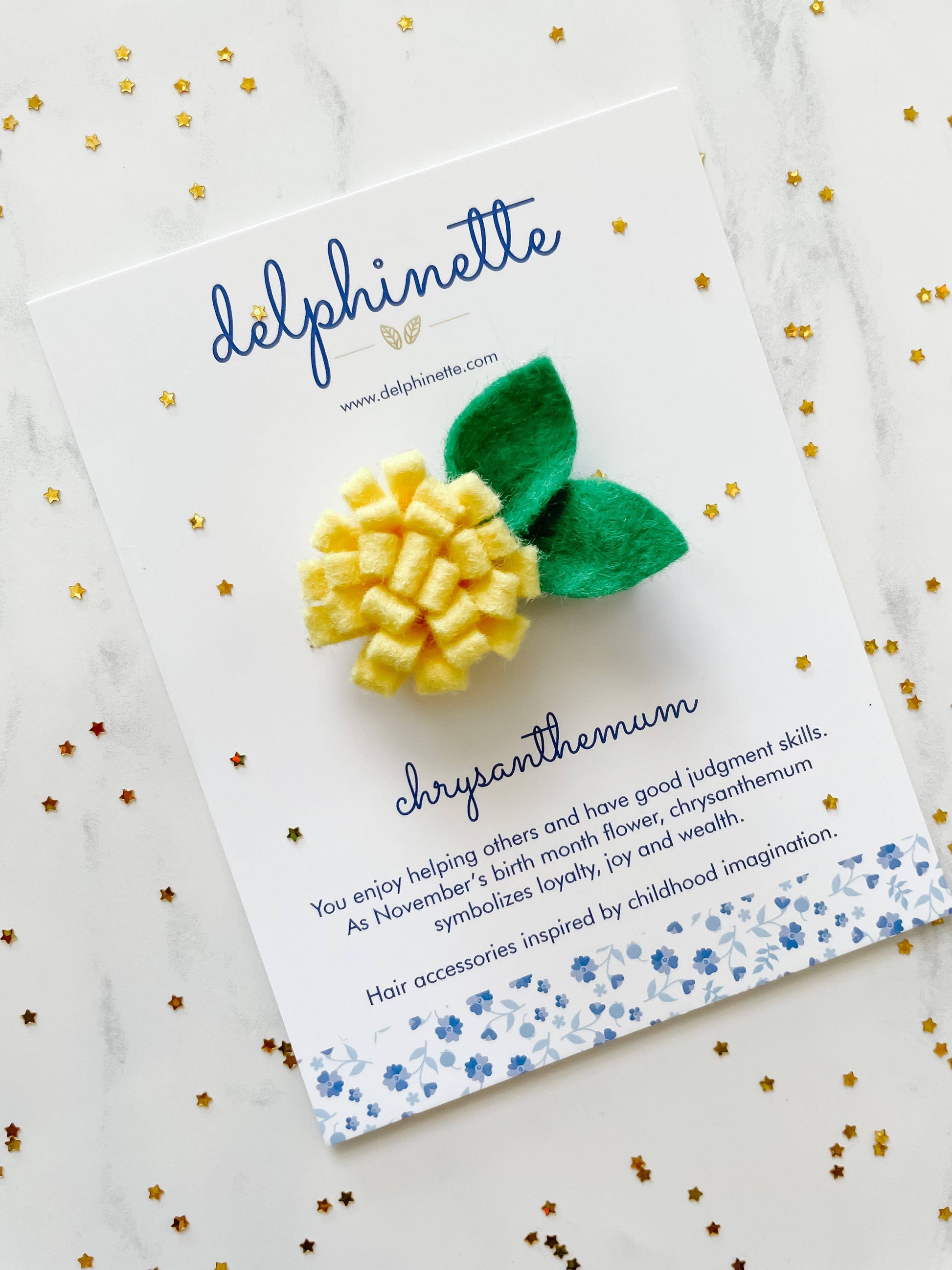 Add that adorable touch to any outfit with this delphinette felt yellow chrysanthemum flower hair clip. As November’s birth month flower, chrysanthemum symbolizes loyalty, joy and wealth. This handmade yellow chrysanthemum flower hair clip would be a sweet addition for a: - Birthday gift - Thoughtful surprise - Fall baby shower gift - Stocking stuffer - November baby due date pregnancy announcement Hair clips are the perfect hair accessory for kids of all ages as they can be worn no matter how thin or thick, or long or short their hair is. Easy to wear and an adorable way to keep bangs out of little one's faces while they're having fun. Measurements are approximately L 5 cm x W 3.8 cm x H 1.3 cm.